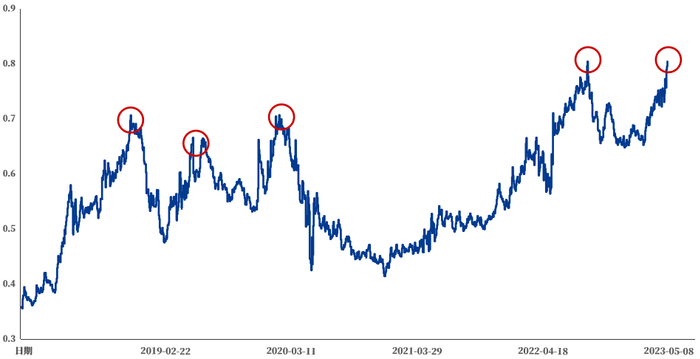 注:红色圆圈表示近五年来股债收益比相对高点。股债收益比计算方式为万得全A股息率/中国国债十年收益率。