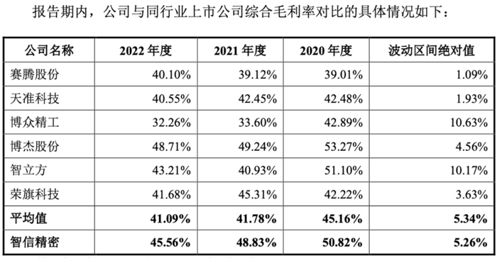 首先在毛利率方面,得益于将资源优先集中于优势领域,优先发展毛利率较高的产品,以及整体技术含量高、竞争性强,智信精密2020-2022年主营业务毛利率分别为50.77%、48.90%和45.47%,相较于同比公司均值45.16%、41.78%、41.09%高出不少,在整体下行态势中维持着较高水平。