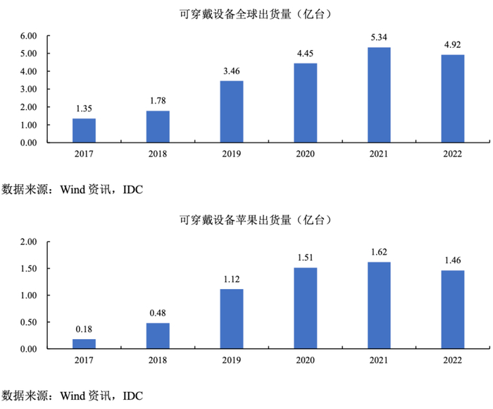 其中2017-2022年全球可穿戴设备出货量由1.35亿台增长至4.92亿台,复合增长率达29.52%,呈现爆发式增长态势。2022年可穿戴设备中,苹果公司出货量1.46亿部,占比29.73%。