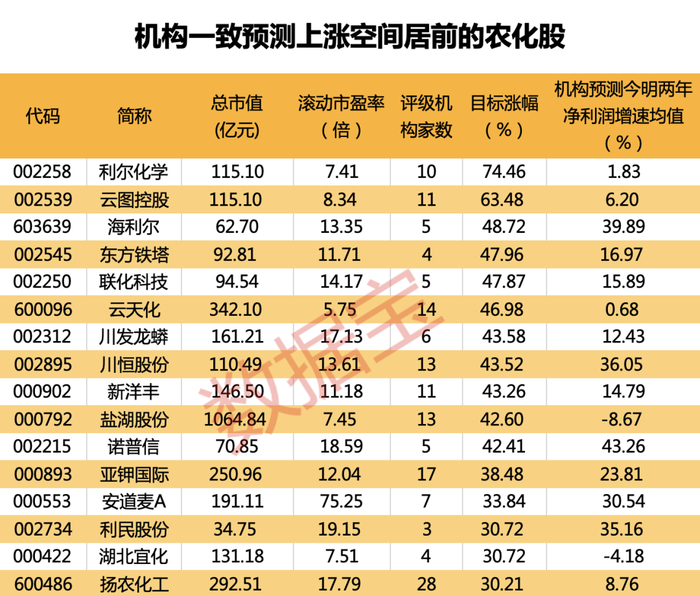 数据宝统计,根据3家及以上机构评级,目标价较最新收盘价上涨空间超30%的个股有16只;另外,海利尔、川恒股份、利民股份今明两年净利润增速上涨空间有望超30%。