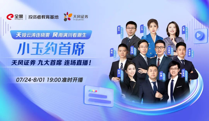 7月24日-8月1日晚19:00,节目走进天风证券专场,全景网主持人小玉直播连线天风证券9位行业首席分析师,分别聚焦宏观、策略、新兴产业、海外&传媒、轻纺、家电、农业、商社、医药共九大行业热点,专业解读当下行业发展趋势和投资主线,引导投资者朋友们以良好的心态、客观的立场看待资本市场。