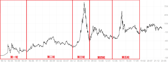 (数据来源:海通证券研报《牛熊永不眠——市场特征分析框架》,发布时间2020/09/03,根据Wind中上证综指刻画;第一轮牛熊周期时间区间1990/12至1996/01;第二轮牛熊周期时间区间1996/01至2005/06;第三轮牛熊周期时间区间2005/06至2008/10;第四轮牛熊周期时间区间2008/10至2013/06;第五轮牛熊周期时间区间2013/06至2019/01)