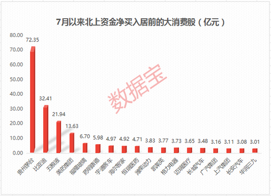 7月以来,北上资金大举净买入贵州茅台、比亚迪、五粮液、美的集团等龙头股,其中贵州茅台买入超70亿元。单周来看,上周北向资金净流入A股最多的个股分别为贵州茅台、宁德时代、五粮液,其中大消费股贵州茅台成为“吸金王”,周内北向资金买入超50亿元。另外,五粮液和比亚迪北上资金净买入分别为19.02亿元、11.3亿元。