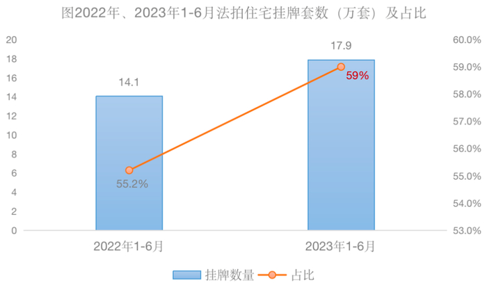 单从数量上说,2023年1-6月法拍房总挂牌量30.4万套,而其中住宅占比最高,高达59%,并且这样的趋势还在上涨。