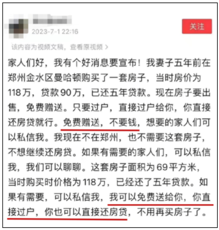 不少业主开始免费送房子,条件只有一个,接下剩余的房贷。