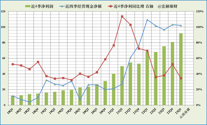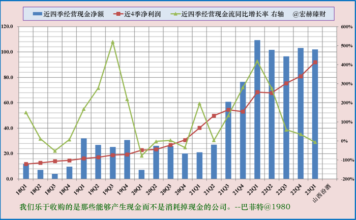 蓝色折线持续在绿色柱图上边及以上,显示净利润含金量高。