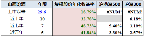 公司上市以来,近十年、近七年、近五年的复权股价年化收益率与同期有效参照规模指数对照如下表: