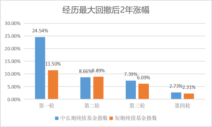 中长期纯债基金两年平均反弹幅度10.83%,短期纯债两年平均反弹7.19%。