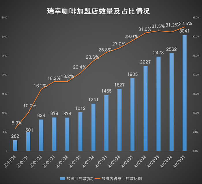 加盟并非新瑞幸才有的模式。旧瑞幸从2019年9月启动加盟,到当年年底开出282间加盟店,占比不到6%。瑞幸2020年初曝出财务造假,直到2021年才重启加盟,2022年加盟比例直线上涨;发展到今年一季度,近一万店里,接近三分之一是加盟店。