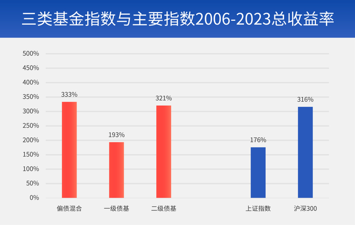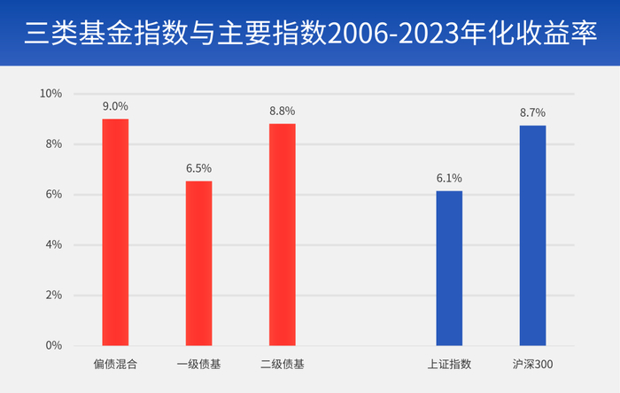 数据来源:Wind,时间区间为2006.1.1-2023.6.30。偏债混合、一级债基、二级债基收益率均为对应的万得基金指数收益率。