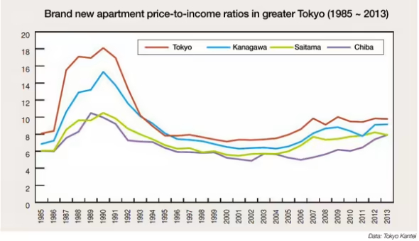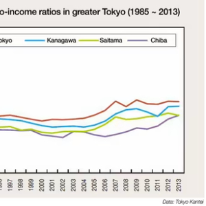 东京都市圈房价,红线是东京都,类似关内五环内核心区,其他是周边县(日本县>市)
