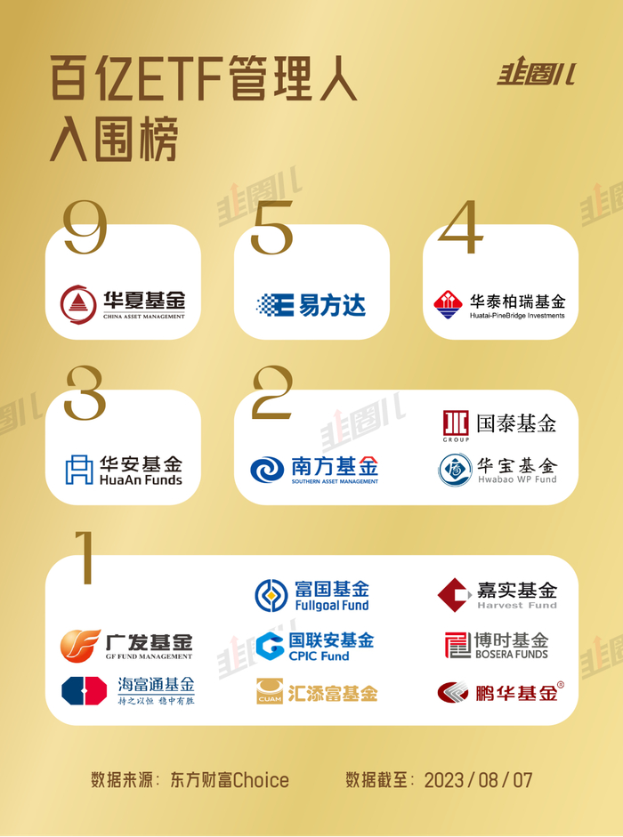 相比于主动权益,目前市场上的百亿股票型ETF还不算多,在百亿ETF的俱乐部里,华夏基金的优势最明显,在华夏后面后易方达和华泰柏瑞分居二三。