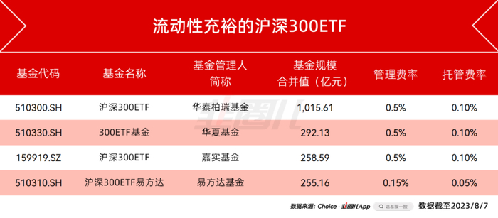 围绕沪深300,场内也有几只流动性很好,规模在200亿往上的ETF,由华泰柏瑞、华夏、嘉实和易方达几家大厂所管理。
