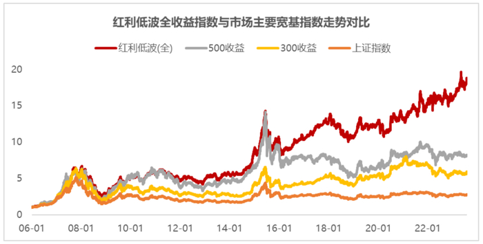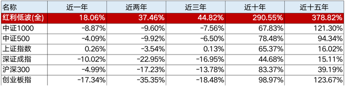 以中证红利低波动全收益指数为例。wind数据显示,中证红利低波动全收益指数自2006年以来,年化涨幅高达18.80%,其近一年、二年、三年、十年、十五年收益也在各大宽基类指数里“名列前茅”。