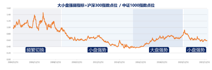(数据来源:Wind,数据区间:2005.1.1-2023.3.31。大小盘强弱指标 =沪深300指数点位/中证1000指数点位。风险提示:历史业绩并不代表未来表现,我国股市运作时间较短,不能反映证券市场发展的所有阶段。)