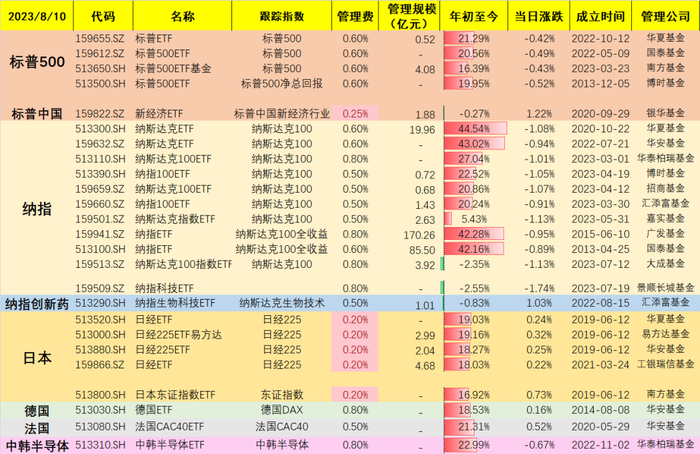 更新两组实时跨境ETF的投资标的,给大家参考,可以选择规模大+费率低的。(低费率已用红色标注)