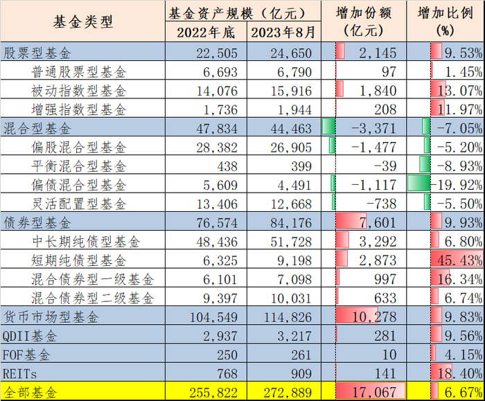 公募最近半年规模增加17000亿。其中,货币与债券增加18000亿,混合基金减少3000亿,指数基金增加2000亿。
