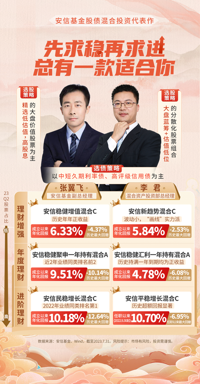 数据来源:安信基金、Wind,截至2023.7.31。股票占比数据来源:基金2023年二季度定期报告,安信稳健增值混合C、安信新趋势混合C、安信稳健聚申一年持有混合A、安信稳健汇利一年持有混合A、安信民稳增长混合C、安信平稳增长混合C2023Q2股票占比分别为:16.77%、13.05%、38.94%、17.53%、47.18%、60.35%。