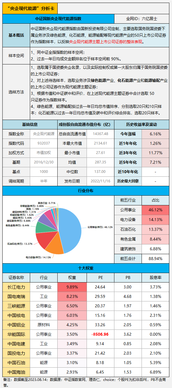 主要涉及绿色能源、化石能源、能源输配等现代能源产业,核心服务于国家能源安全碳中和、碳达峰远景。该指数估值整体低于央企平均水平,ROE为11.14,超越其他三个指数。其第一权重股是长江电力,是很多躺平投资者的爱股。