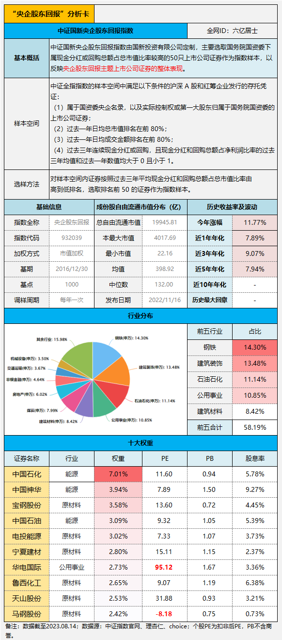 该指数并非专注特定行业,但关注现金分红或回购总额占比总市值率较高的企业,完整的体现“股东回报”的指数。
