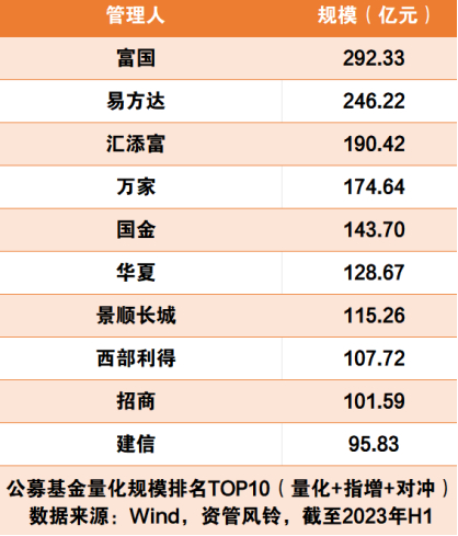 对量化业务的重视程度,尤以国金基金为甚,其292.5亿元的非货规模中,量化基金的占比居然接近一半。