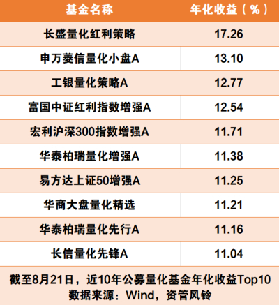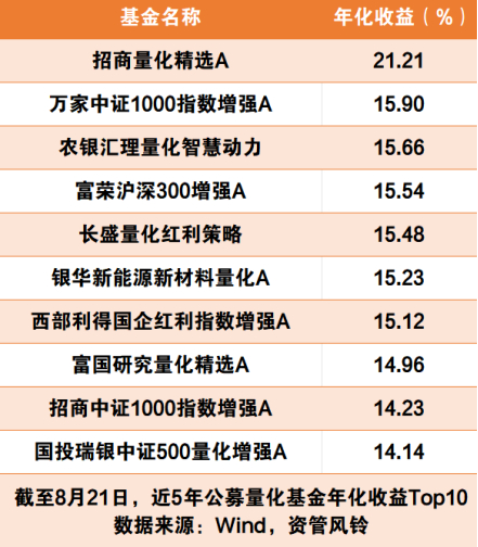 资管风铃统计Wind数据发现,截至821日的近5年来回报排名TOP10产品的平均年化收益达15.7%,其中多达7只产品的年化回报率超过了15%,近5年收益最高的招商量化精选A,年化收益更是达到了21.2%