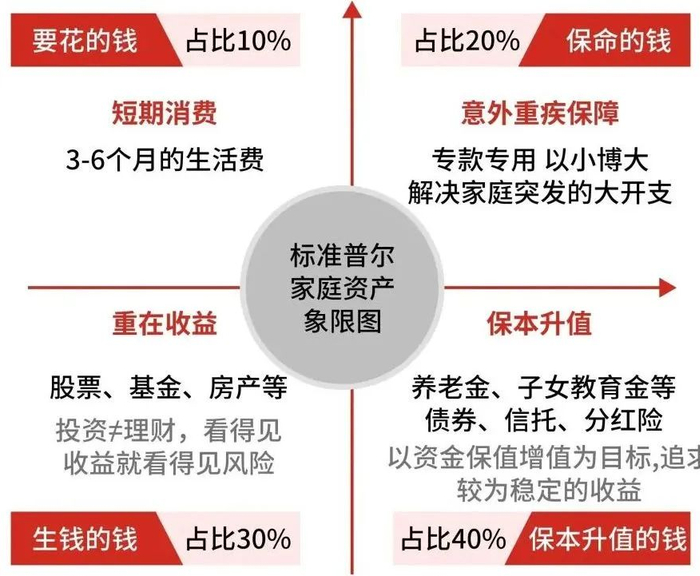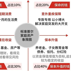 根据全球公认的家庭资产普尔图可以发现,我们需要把家庭资产分成作用不同、投资渠道各不相同的四个账户。只有拥有这四个账户,并且按照固定合理的比例进行分配才能保证家庭资产长期、持续、稳健的增长。