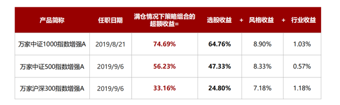 据乔亮介绍,这份超额收益主要源于选股收益、风格收益和行业收益,其中尤其以选股收益最为突出,代表产品万家中证1000指数增强的选股收益高达64.76%,中证500指增和沪深300指增选股收益也高达47.33%和24.87%,贡献了系列量化指增产品的绝大部分超额。