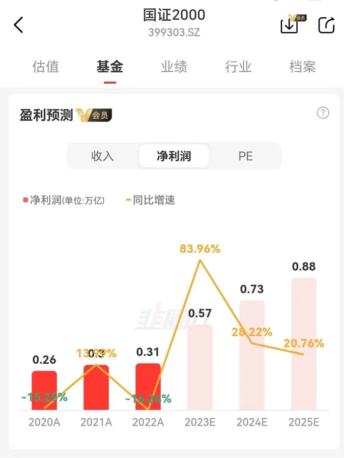 韭圈儿APP的Pro会员有个专享功能,可以看到各主流指数的基本面情况,数据显示市场对2023年国证2000总体净利润的增速预测高达80%,2024年还会在高基数的情况下获得28%的增长。