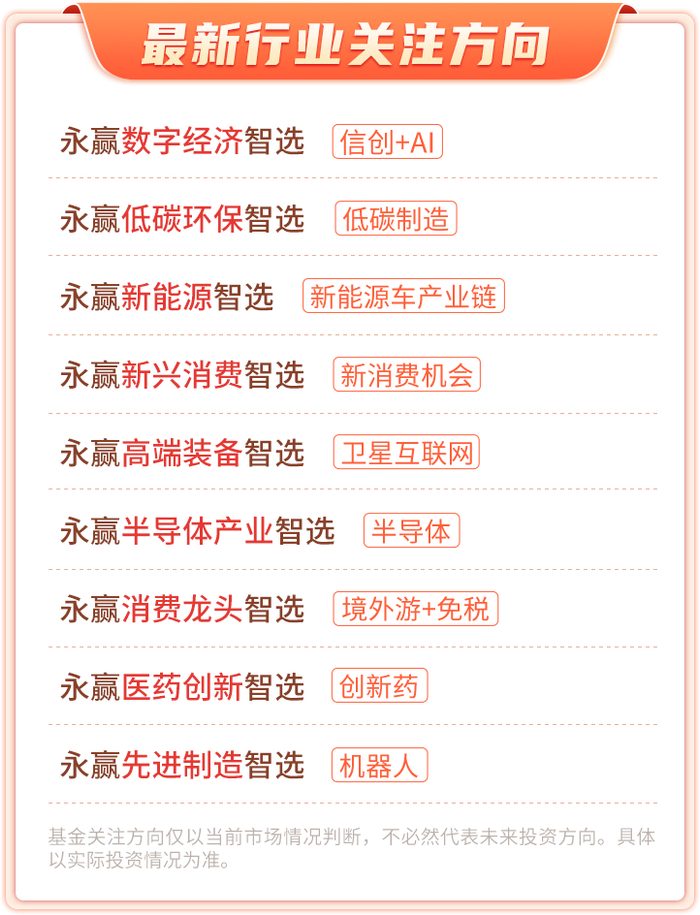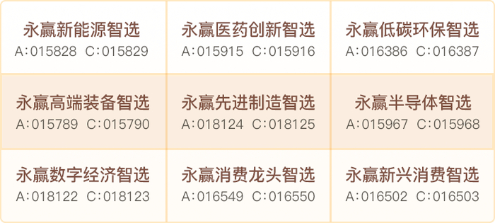 风险提示:投资有风险,投资需谨慎。基金管理人承诺以诚实信用、勤勉尽责的原则管理和运用基金资产,但不保证本基金一定盈利,也不保证最低收益。基金业绩指标不包括持有人交易基金的各项费用,计入费用后实际收益水平要低于所列数字。基金的过往业绩及其净值高低并不预示其未来业绩表现,基金管理人管理的其他基金的业绩并不构成对基金业绩表现的保证。投资不同类型的基金将获得不同的收益预期,并承担不同程度的风险。通常基金的收益预期越高,风险越大。永赢新能源智选混合发起、永赢高端装备智选混合发起、永赢半导体产业智选混合发起、永赢低碳环保智选混合、永赢医药创新智选混合、永赢消费龙头智选混合、永赢新兴消费智选混合、永赢数字经济智选混合、永赢先进制造智选混合为中风险(R3)等级,适合风险等级为平衡型(C3)及以上的投资者投资。基金风险等级与投资者风险承受能力等级对照表详见永赢基金官网。投资者通过代销机构提交交易申请时,应以代销机构的风险评级规则为准。以上产品可投资于港股通标的股票,除了需要承担与境内证券投资基金类似的市场波动风险等一般投资风险之外,还面临汇率风险等境外证券市场投资所面临的特别投资风险。敬请投资者在做出投资决策之前,仔细阅读产品法律文件,充分认识基金的风险收益特征和产品特性,充分考虑自身的风险承受能力,理性判断并谨慎做出投资决策。