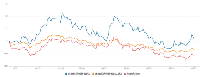 业绩及净值数据来源永赢基金,经托管行复核。永赢医药创新C成立以来业绩/业绩基准为2.45%/-6.74%。创新药指数来源Wind。以上数据区间均为2022/11/22-2023/7/31,其余详见文末注释。