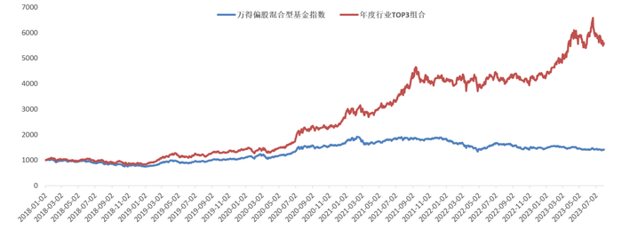 Wind,偏股基金取万得偏股混合型基金指数,885001.WI,行业取申万一级行业,2018/1/1-2023/7/31,年度行业TOP3组合取3个行业的平均涨幅进行测算
