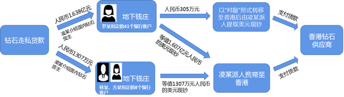 2018年9月至2020年6月期间,凌某安排国内钻石货主分别通过罗某、林某、方某指定的地下钱庄兑换等值人民币1.74亿元的美元现钞,其后凌某派人从深圳携带至香港支付给走私钻石国内货主指定的香港钻石供应商。
