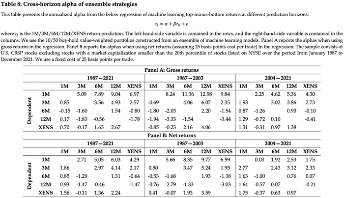 3、对1M、3M、6M、12M、XENS的多空收益两两配对做回归,表格中的数字是回归的截距,也就是未被自变量解释的部分。Panel A用的费前收益,Panel B用的费后收益。无论从Panel A还是B,都可以看出,短周期的收益大部分不能被中长周期的收益解释,而中长周期的能被短周期解释。但是相对费前,费后中长周期无法被短周期解释的部分更大,说明经过长期预测训练的机器学习模型能够释放额外的净Alpha。