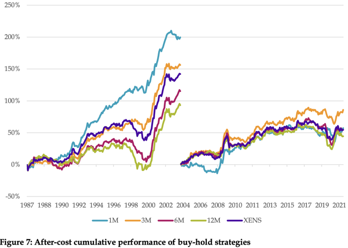 1、整体而言模型越复杂,表现越好;复合模型表现最好。(费前)预测周期越长,策略表现越差。在互联网泡沫破裂和全球金融危机期间,这些策略都表现强劲,在2018年至2020年所谓的“量化危机”期间,特别是价值投资挣扎普遍存在弱点。其次,在样本的后半段,性能显著减弱。在2004年后的这段时间里,1M策略与其他周期的差异显著减小。(费后)1M相对其他周期的优势不再那么明显,而且2004年之后甚至表现垫底。