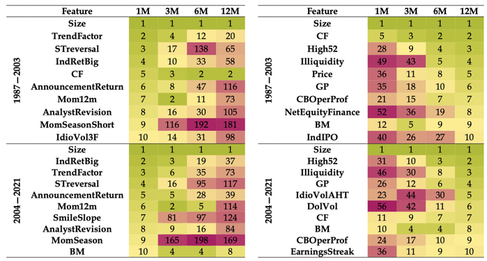 在12M预测期里,与价值(BM、CF和NetEquityFinance)、盈利能力(GP和CBOperProf)和动量(High52)相关的更传统的因子占主导地位。在所有四个预测范围内,我们发现Size特征是最重要的。在某种程度上,这是由样本早期规模因子的强劲表现驱动的,导致模型将规模确定为回报的强大预测因子这也部分解释了2004年后模型表现较弱的原因,当时规模因子的表现衰减严重。