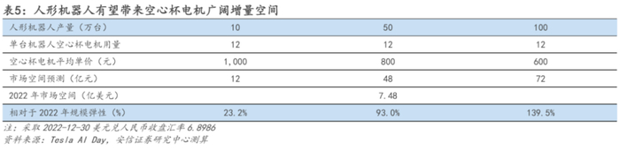 以此假设为前提,在人形机器人销量分别为10、50、100万台时,空心杯电机市场规模分别为12、48、72亿元,相对于2022年市场规模的弹性分别为23.2%、93.0%、139.5%。