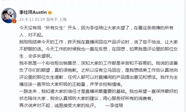 9月11日凌晨,李佳琦通过其个人微博就直播间争议言论发文致歉:“称深知大家工作辛苦和不容易,会认真倾听大家的建议,用心服务好所有的消费者。”道歉似乎安抚不了广大粉丝的愤怒,第二日李佳琦微博就累计掉粉超66万。当晚,李佳琦在直播中痛哭道歉。而不少网友仍不买账。