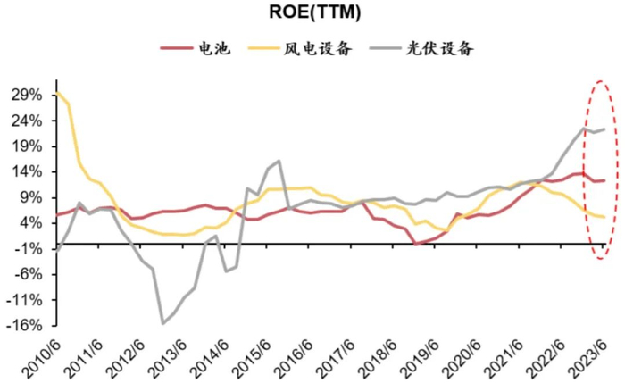 → 新能源车产业链产能周期已高位回落,整车产能周期底部抬升,周转率改善。→ “中美缓和小周期”下,海外需求稳定,风光产业链结构性分化,下游盈利能力明显改善。光伏设备整体收入增速和盈利增速小幅回落却仍处高位。相对下游的逆变器、光伏组件、磁性材料、电机、锂电池等行业ROE明显改善。