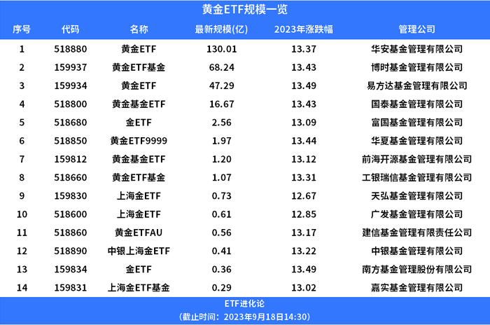 境内14只黄金ETF净值均在近期创下年内新高,年内收益最高突破13%。A股市场黄金ETF马太效应显著,全市场14只黄金类ETF,华安基金、博时基金、易方达呈三足鼎立之势。