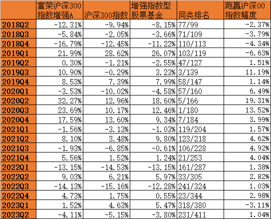 在郎骋成单独管理的2023年富荣沪深300指数增强表现似乎并不如此前那般出色,在2023年1季度跑输沪深300指数3%,要知道此前产品已经连续15个季度跑赢沪深300指数!