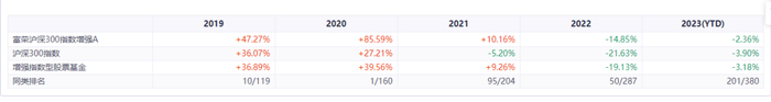 同时,富荣沪深300指数增强还大幅度战胜同类产品,2019年、2022年、2021年和2022年在沪深300指数增强产品中分别排名第2、第1、第1和第6名。
