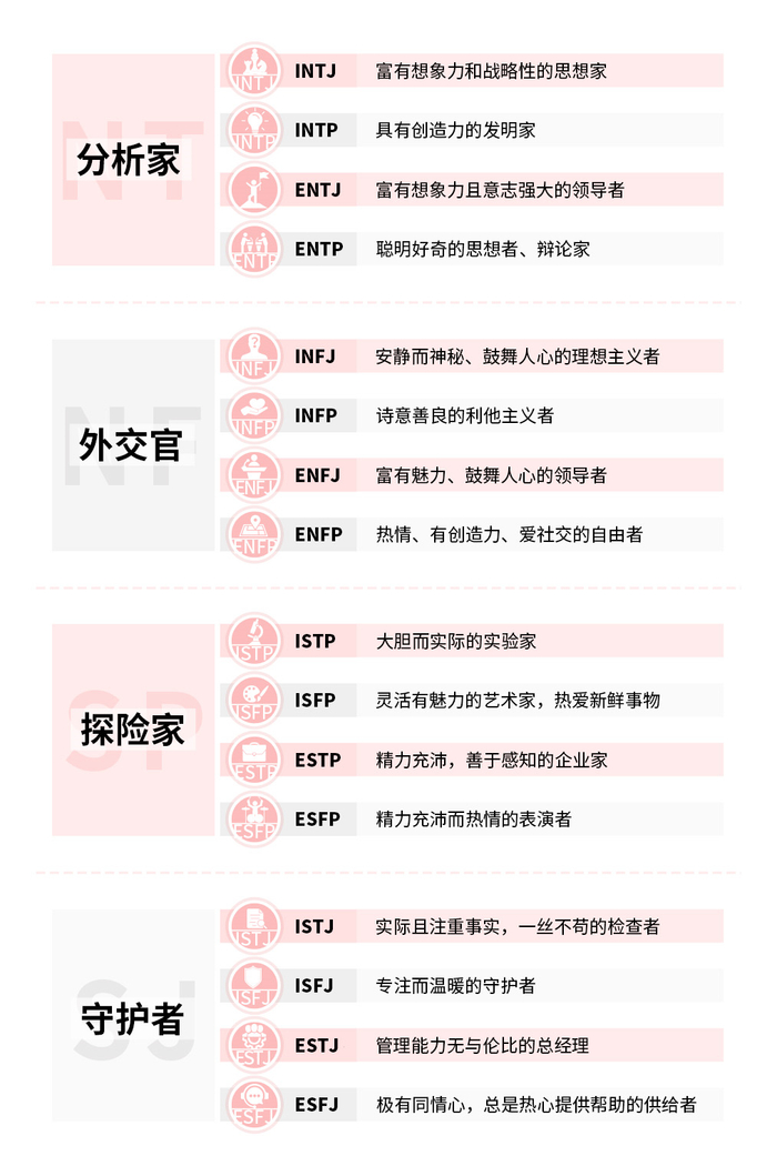 根据不同性格方向,我们可以将人群分为四个大类,分别是NT-分析家、NF-外交家、SP-探险家、SJ-守护者。