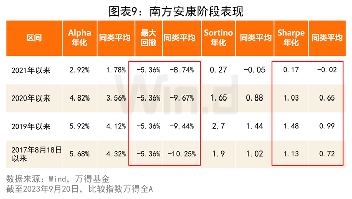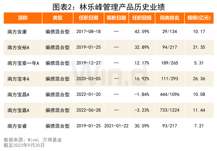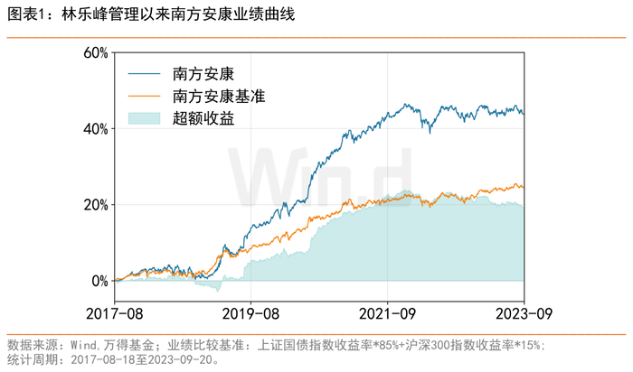 Wind数据显示,自林乐峰2017年8月18日管理南方安康以来至2023年9月20日,基金年化收益6.12%,期间最大回撤低于5.4%。