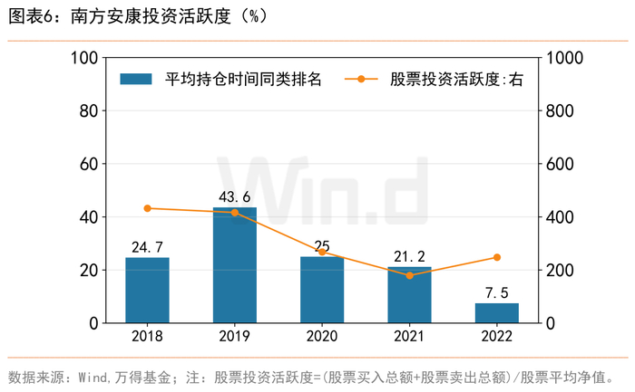 从基金的换手率来看,2021年之后有明显下降,2022年处于同类换手率最低的前7.5%。以重仓股季度调换衡量,近6年来,季度平均调换重仓股3.5只,留存率在65%,稳定度较高。