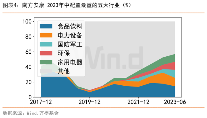 南方安康在行业配置上较均衡,单一行业配置基本不超过20%,这一特征在2021年末表现得更加明显。2023年中,第一大重仓行业食品饮料占比为14.43%;前5大重仓行业占比均在10-15%之间。