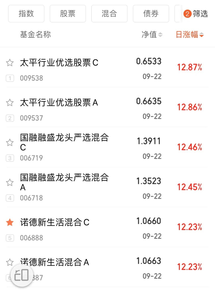 具体的行情老K就不去多说了,看9月22日的基金净值表现,太平行业优选股票、国融融盛龙头严选混合、诺德新生活这三只基金单日涨幅都超过了12%!