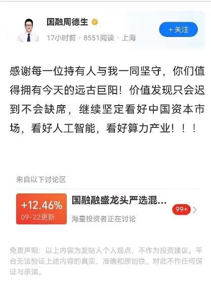国融融盛龙头严选的基金经理在社区里发言,称持有的基民值得拥有这个“远古巨阳”,并直言看好人工智能,看好算力产业。