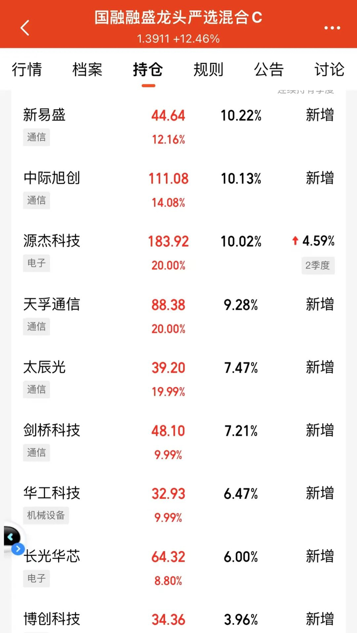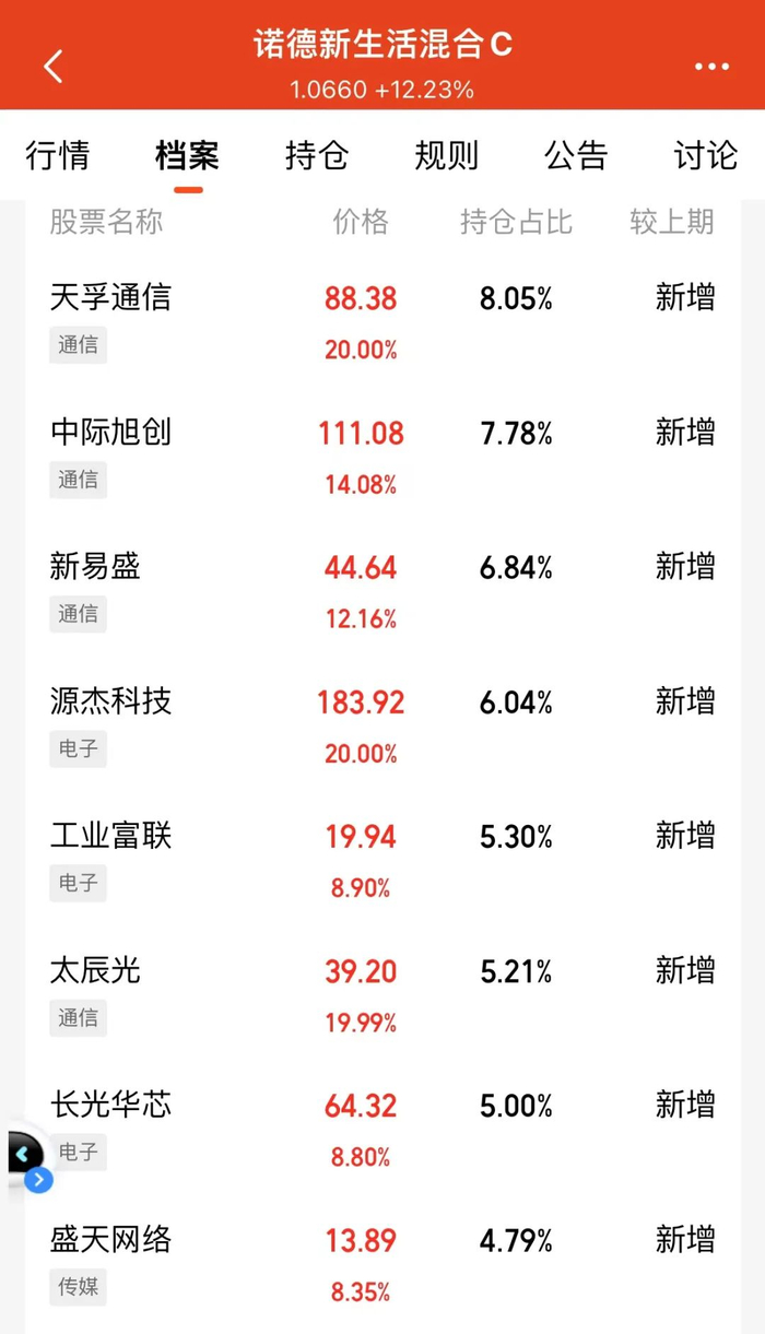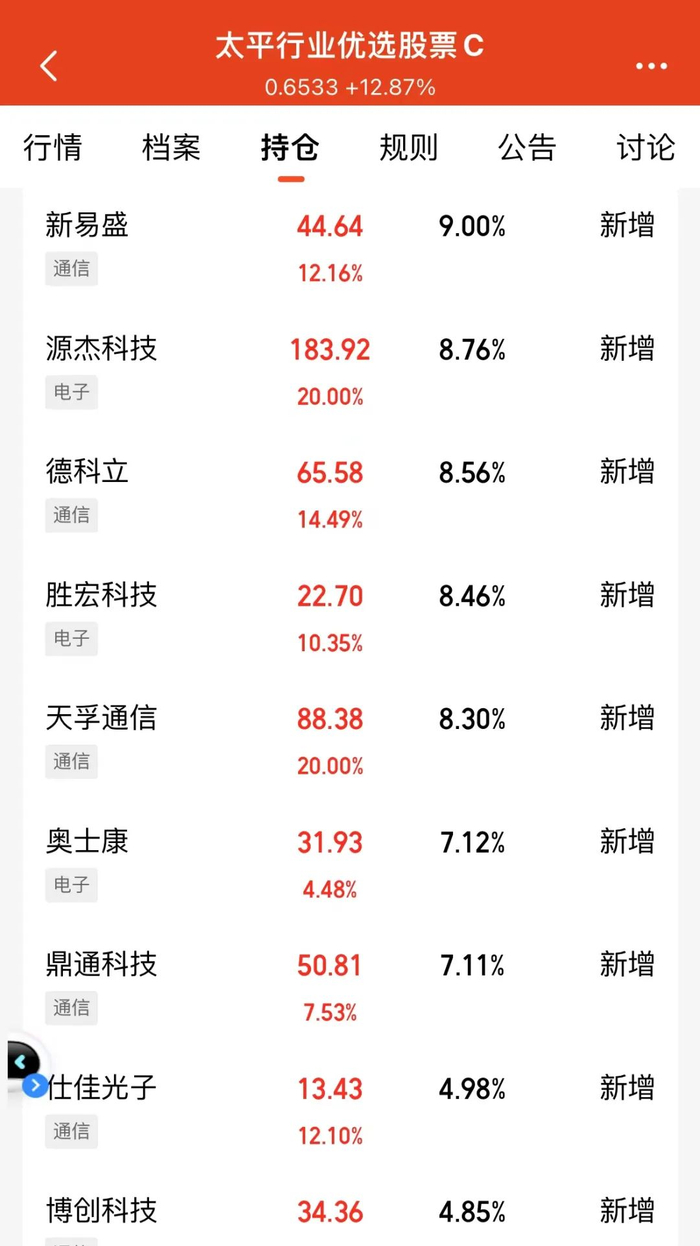 这三只基金单日涨幅能超过12%,可不是因为异常波动,从前十大重仓数据来看,太平行业优选、国融融盛龙头严选、诺德新生活这三只基金都重仓了AI相关概念龙头天孚通信、源杰科技这两只20CM涨停的股票,而且还有其他不少涨超10%的股票。