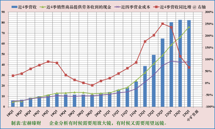 绿色折线接近或高于蓝色柱图上边,显示营业收入含金量高。